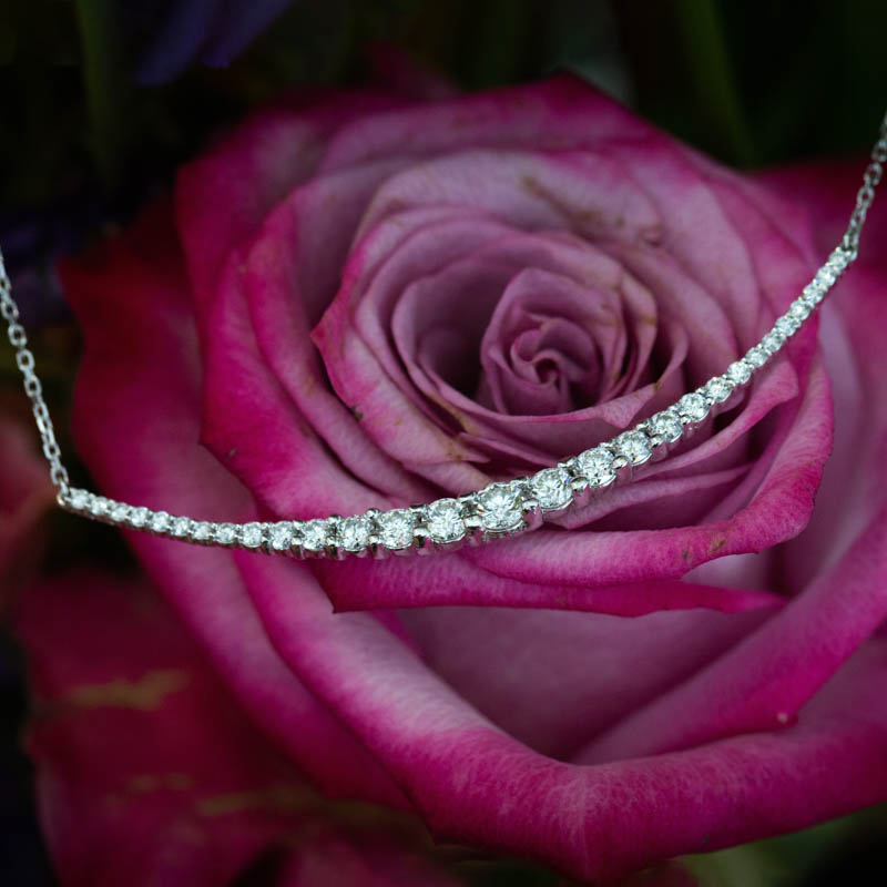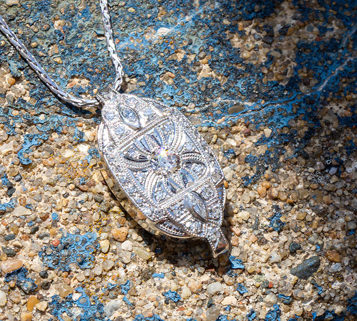 This custom opal necklace was designed by Ben and hand-fabricated by Mitchell in collaboration with our client. It is designed and built around the specially selected opal and includes blue, pink, and clear diamonds set in sterling silver and 14k rose gold.
